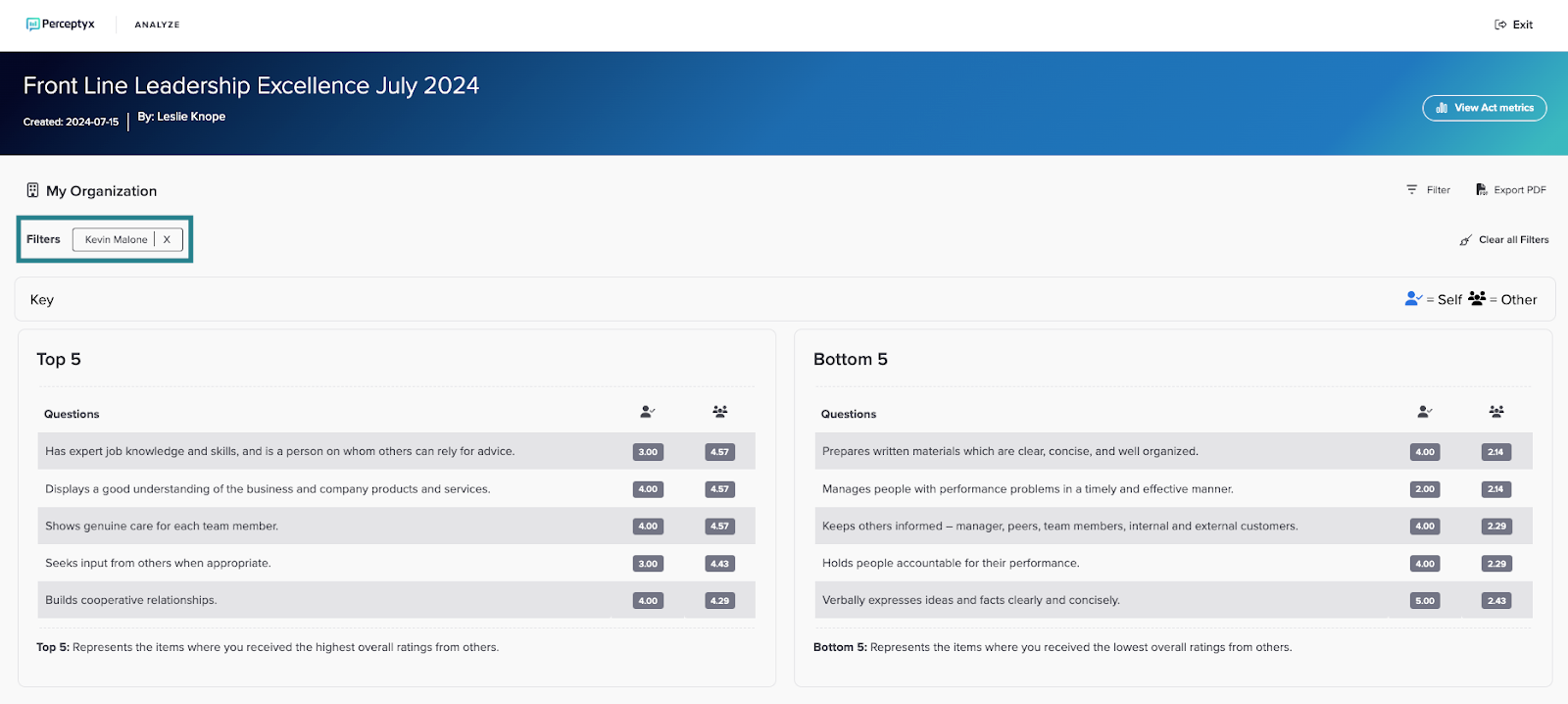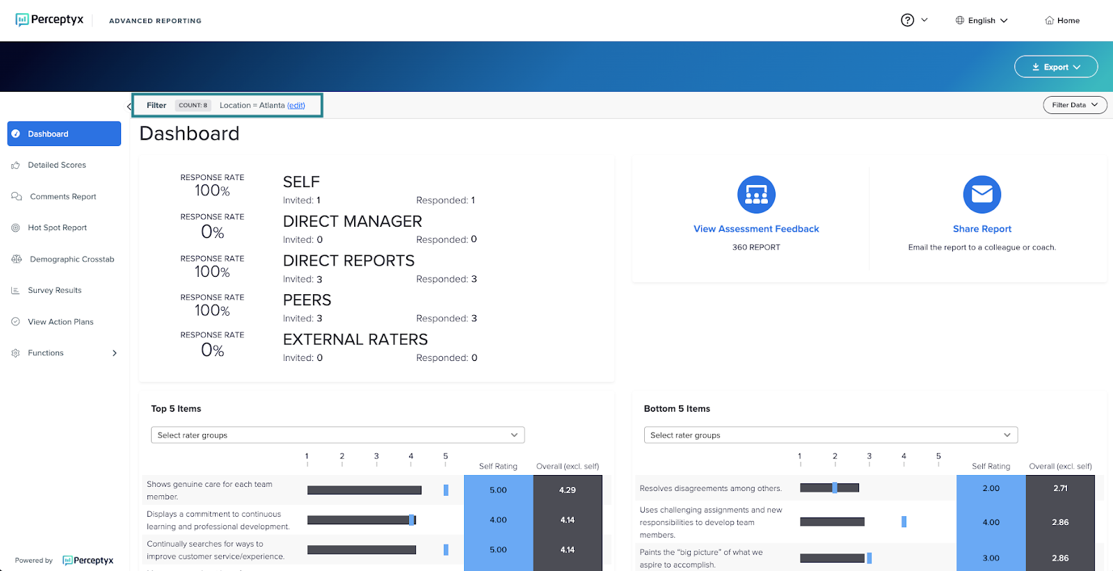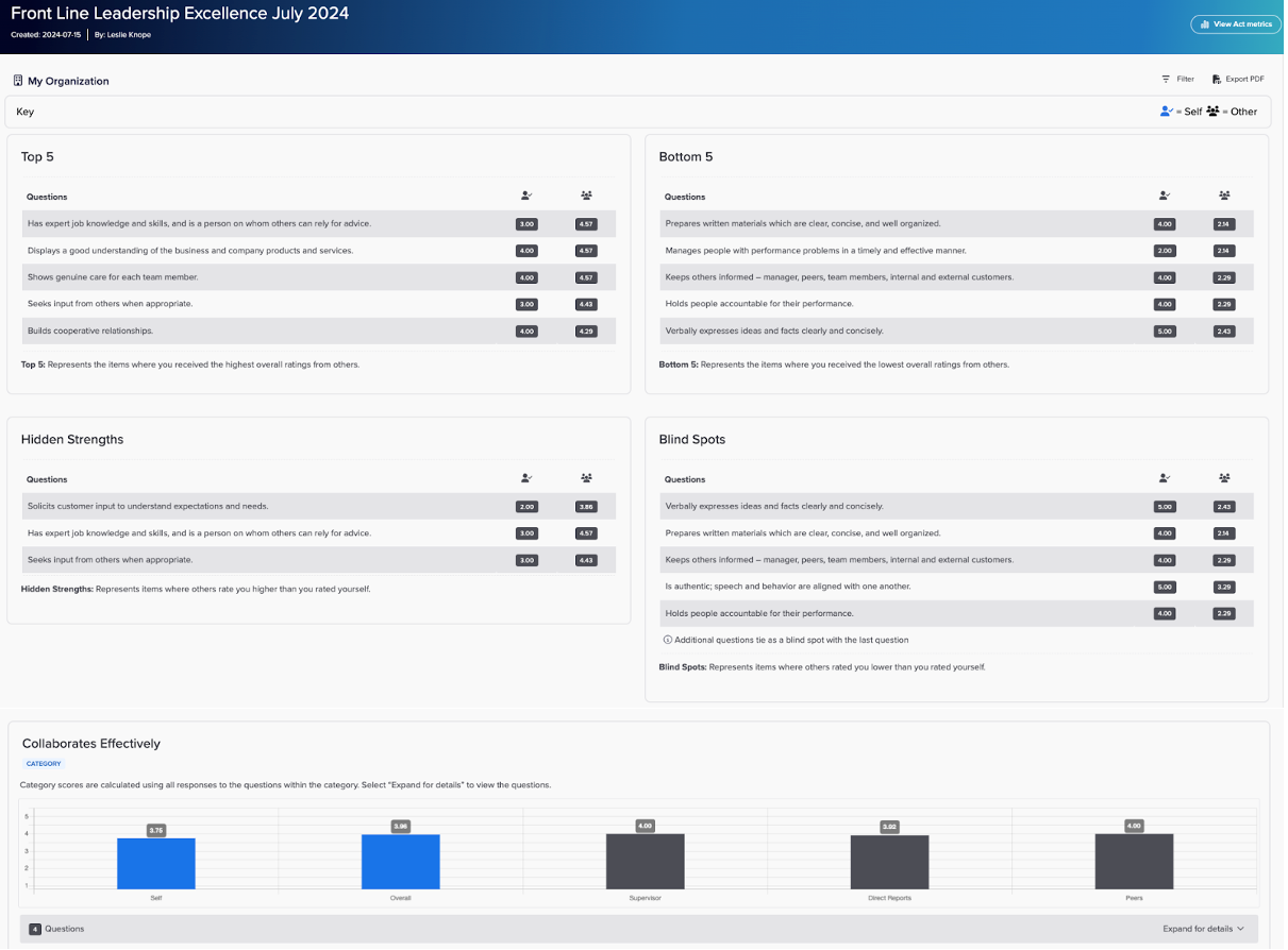 Filtering enables you to focus on specific demographic groups (if available) or participants to gain insight on strengths and development opportunities.