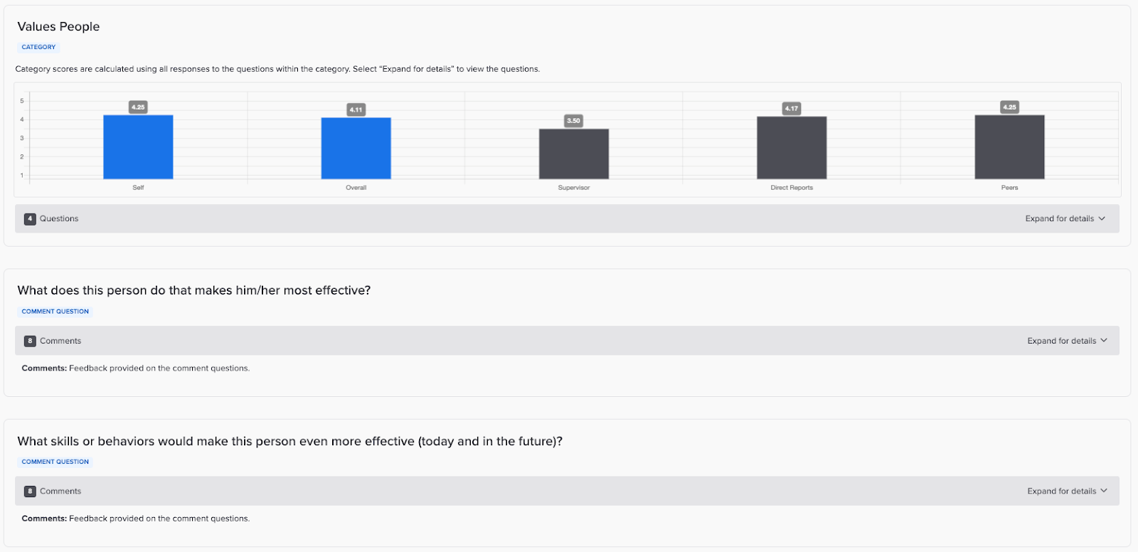 As with the category summary, the question summary includes the overall rating, self-ratings (if participants were required to complete a self-assessment), and ratings for each relationship type.