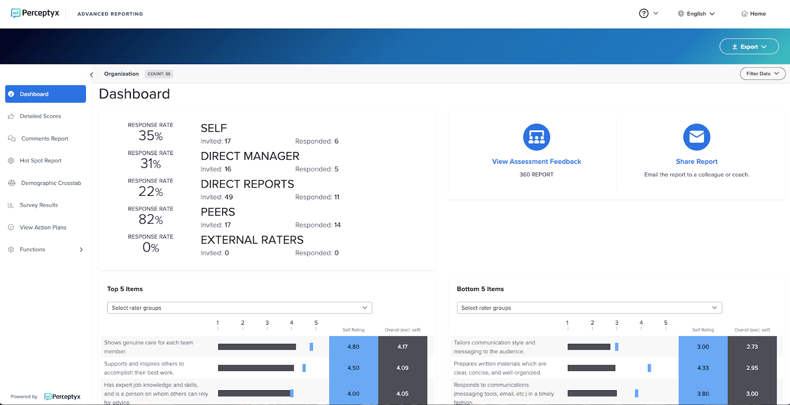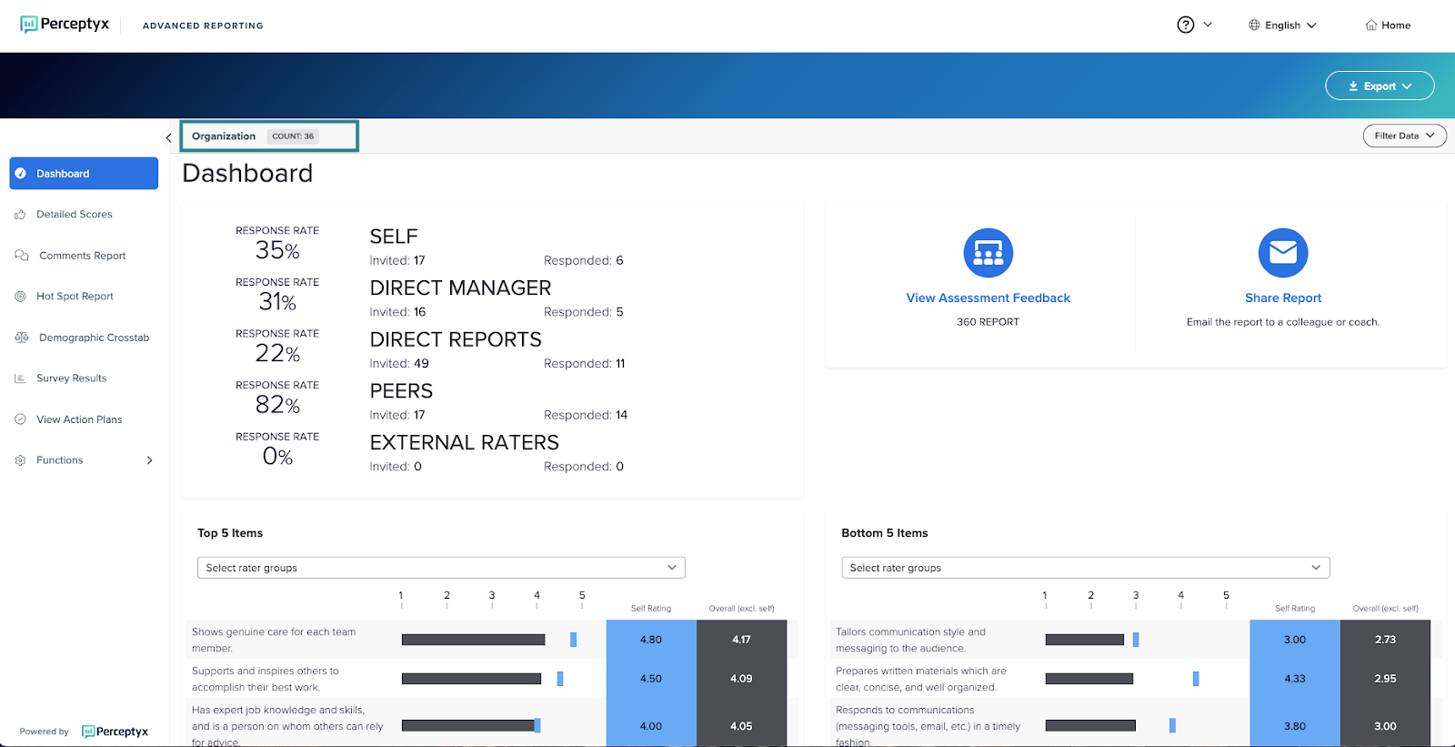 By default, the dashboard displays results based on aggregated responses from everyone who submitted a completed assessment - participants and raters. The total count of individuals who completed the assessment displays at the top of the dashboard. In the following example, a total of 36 individuals completed the assessment.