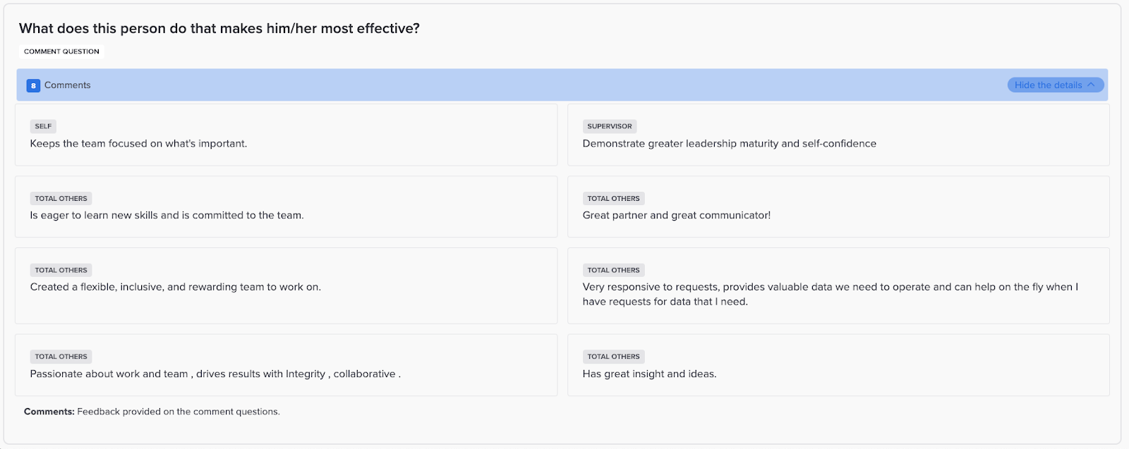 When you click Expand for Details for an open-ended (comment) question, the dashboard displays each submitted comment. Participant (self) comments (if participants were required to complete a self-assessment) and Supervisor comments are clearly identified and comments from all other relationship types are identified as “Total Others.”