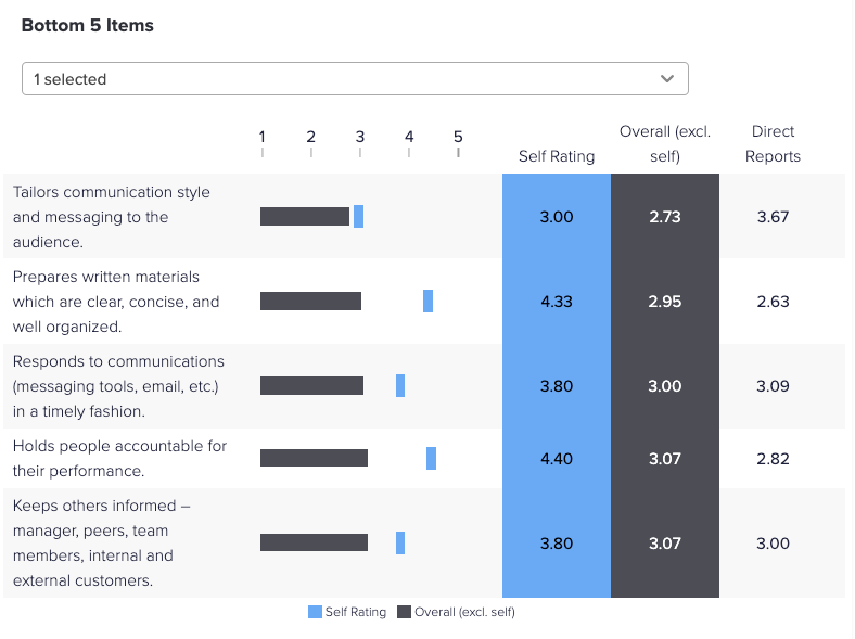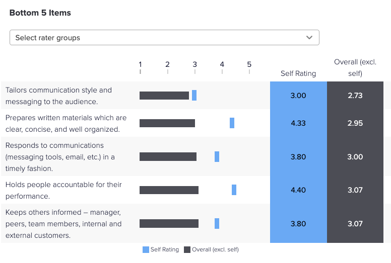 Each section uses color coded bars and separate columns to show how participants rated themselves (Self Rating) and how others rated them (Overall excl. self), as shown in the following example. This visual depiction helps you quickly identify items for which participants and their raters perceive participants’ capabilities differently.