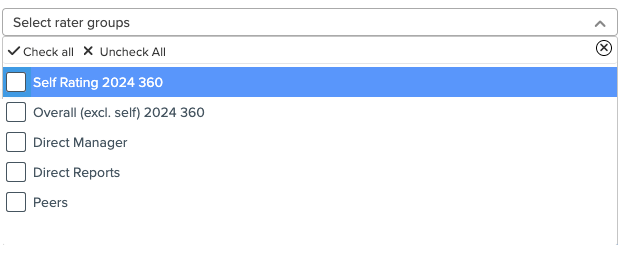 Each section also includes a Select Rater Groups dropdown you can use to display results columns for specific types of raters.