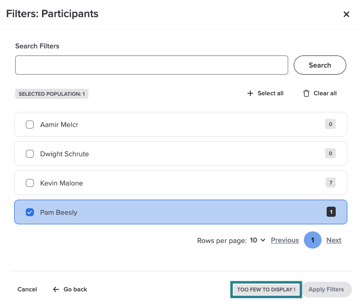 If you choose a participant whose response count doesn’t meet the minimum threshold, a warning appears at the bottom of the dialog box and you are unable to apply the filter.