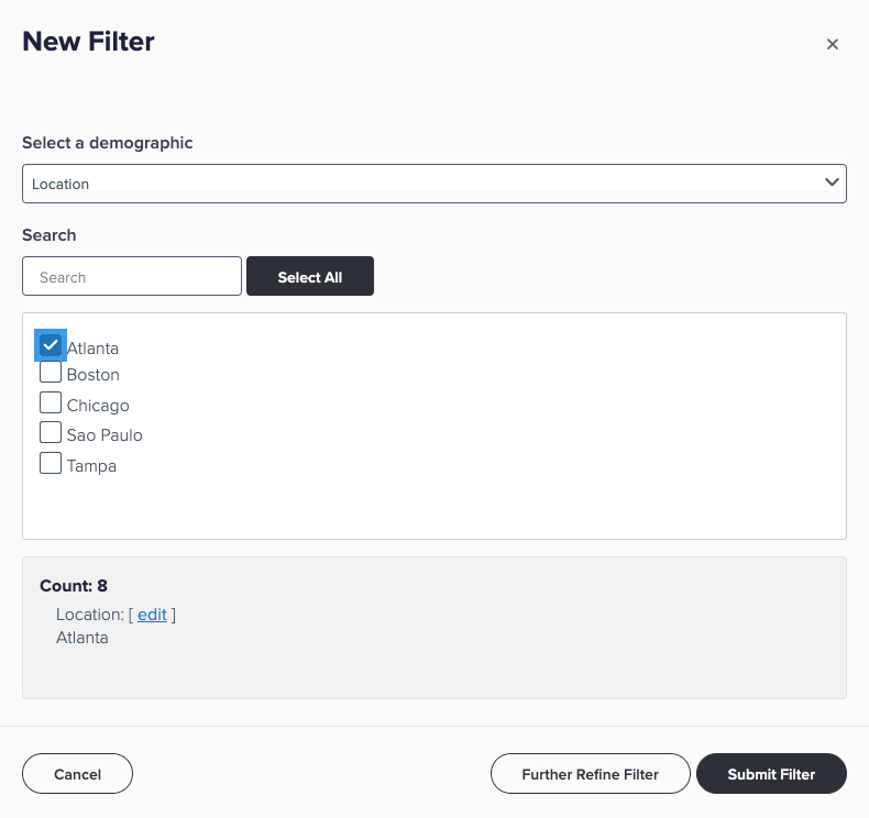 The results will select participants matching the selected filter along with all of their raters. For example, selecting the location “Atlanta” will include all participants located in “Atlanta” and all their raters even though some raters are not located in Atlanta.