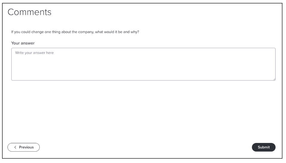 Participating in a Point-In-Time or Lifecycle event is a simple and confidential process. With support for unique links, Single Sign On (SSO), and multiple devices, access is quick and easy. You can click response options to answer quantitative questions and type free form responses to answer open-ended questions. Navigation buttons enable you to move back and forth between event pages so you can easily review or modify responses. When you are ready, you can submit your responses with a single click.