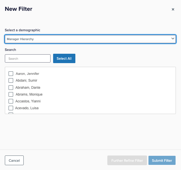 The Manager Hierarchy (roll-up) filter option displays results for a specific manager’s entire segment of the organizational hierarchy - that is, results for all employees under the selected manager, down to the lowest level (direct reports and anyone under them).