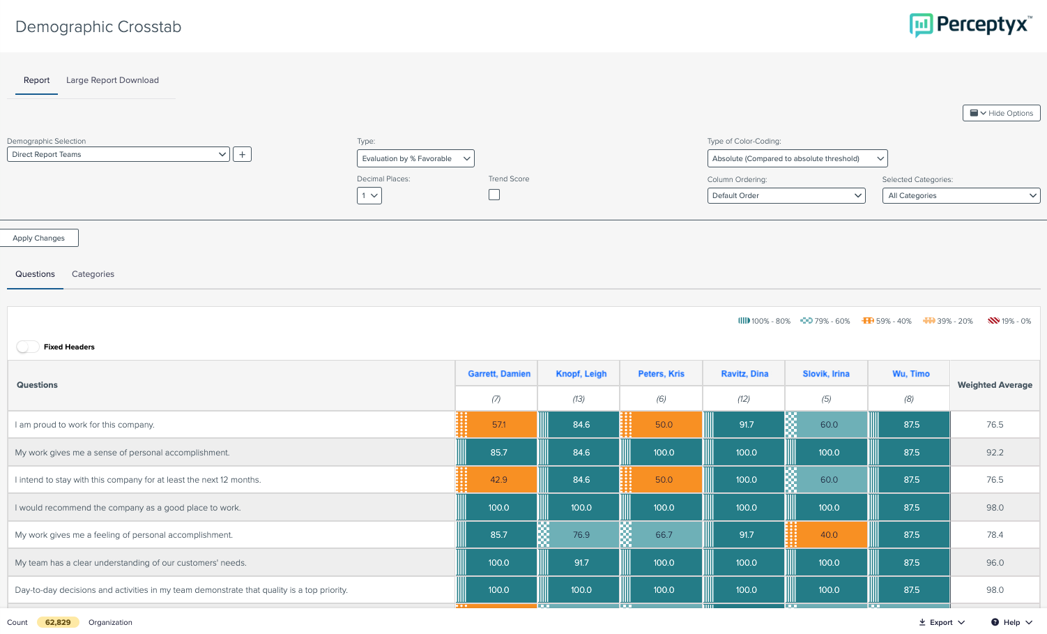 The Direct Report Team filter is used exclusively in the Demographic Crosstab Report. This filter displays data for the direct reports of a selected manager’s direct reports - that is, only the employees who report directly to managers of the selected manager. Results for each of these managers’ direct reports appear side by side in the Demographic Crosstab Report.
