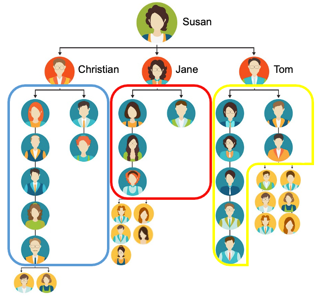 For instance, in the following example, if you select the Direct Report Hierarchy filter and select Susan, results display for all employees, down to the lowest level, under Christian, Jane, and Tom. The entire hierarchy results for Christian, Jane, and Tom’s organizations appear side by side in the Demographic Crosstab Report. The employees whose results you’ll see in this example are circled in blue, red and yellow, respectively.