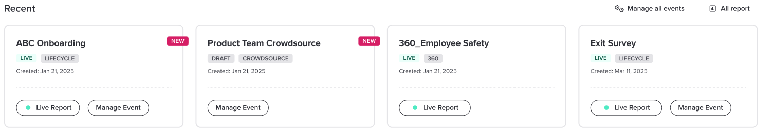 The Recent section displays the four most recently created, modified, launched, or closed events, along with action buttons for working with each event. Action buttons vary based on the status of the event. For example: