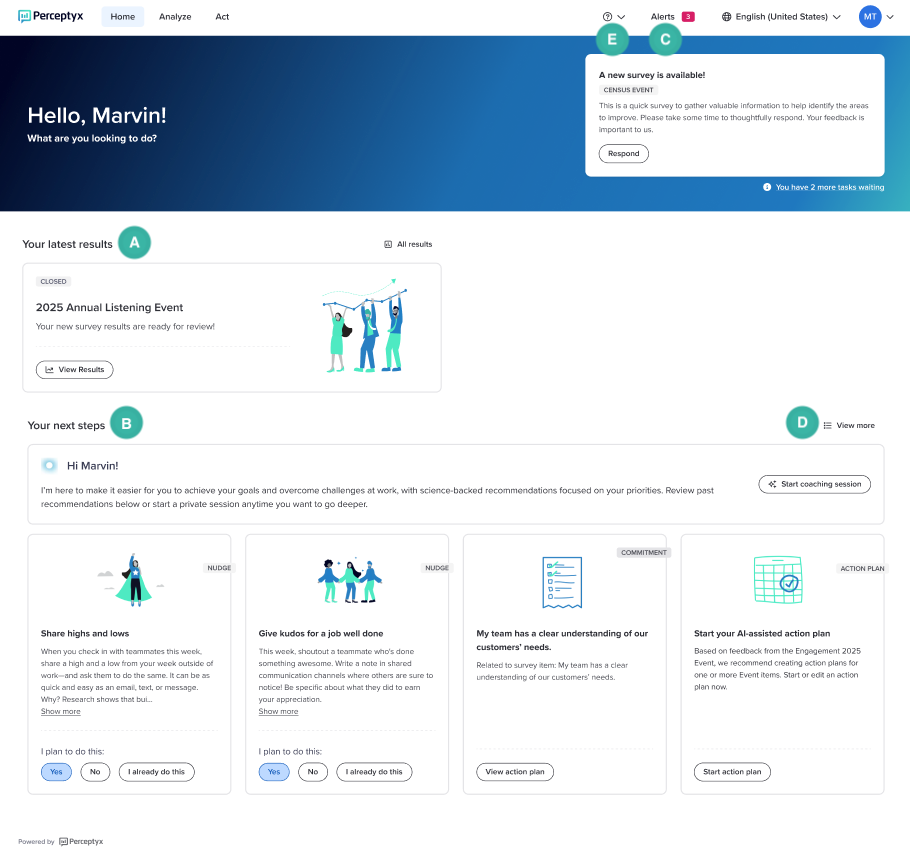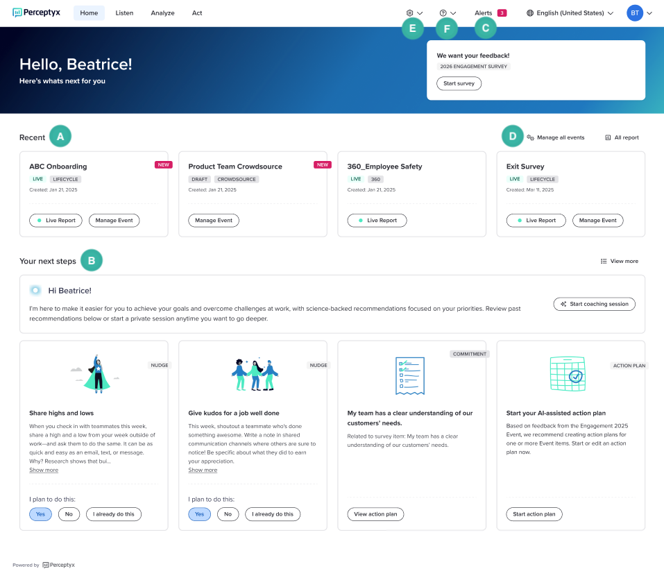 The Home page is your first stop after logging in to the Perceptyx Platform and is the central location for all your listening tools, activities, and insights. The Home page is designed to focus your attention on recent listening events and your next steps in the listening process (for example, completing a listening event, analyzing results, or working on action plans). What you see on your Home page is based on your role, permissions, company configurations, and purchased features.