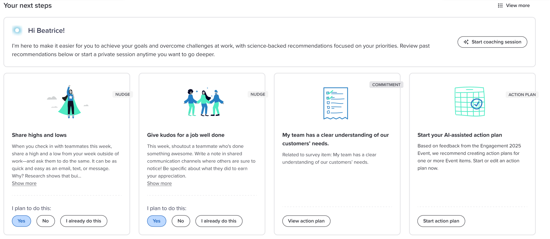 The Your Next Steps section displays your most recent Intelligent Nudges (if enabled), action plan invites, and commitment reminders for existing action plans. These items are all designed to help you initiate and follow through on action planning.