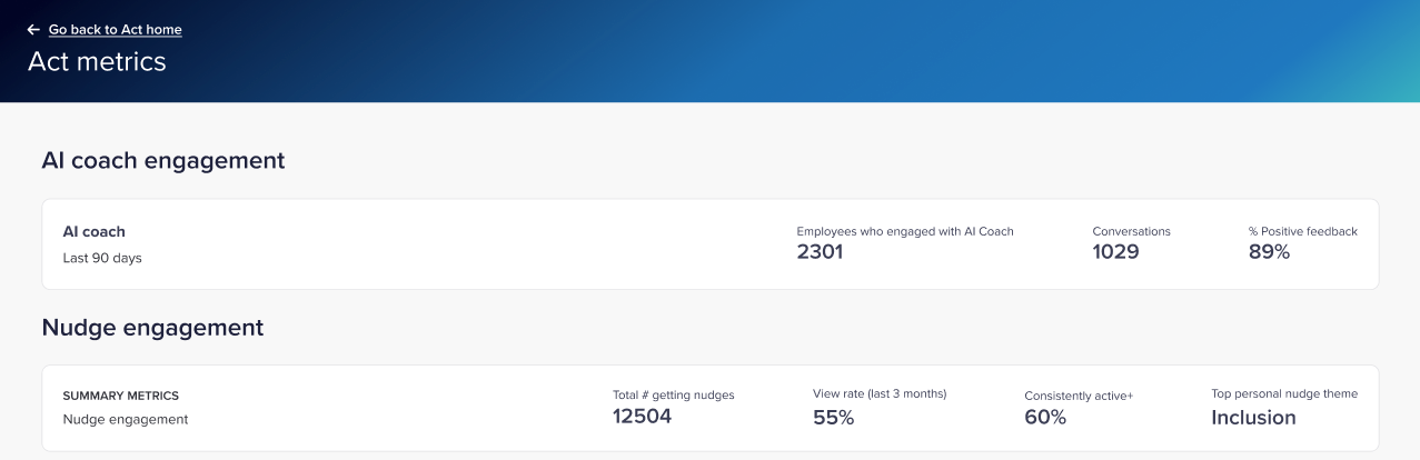 If you are an Admin user, you can assess how employees are engaging with and receiving support from AI Coach. The Act Metrics Dashboard displays aggregate data about how many employees engaged with AI Coach over the last 90 days, how many conversations were initiated, and the percentage of positive feedback (Thumbs Up).