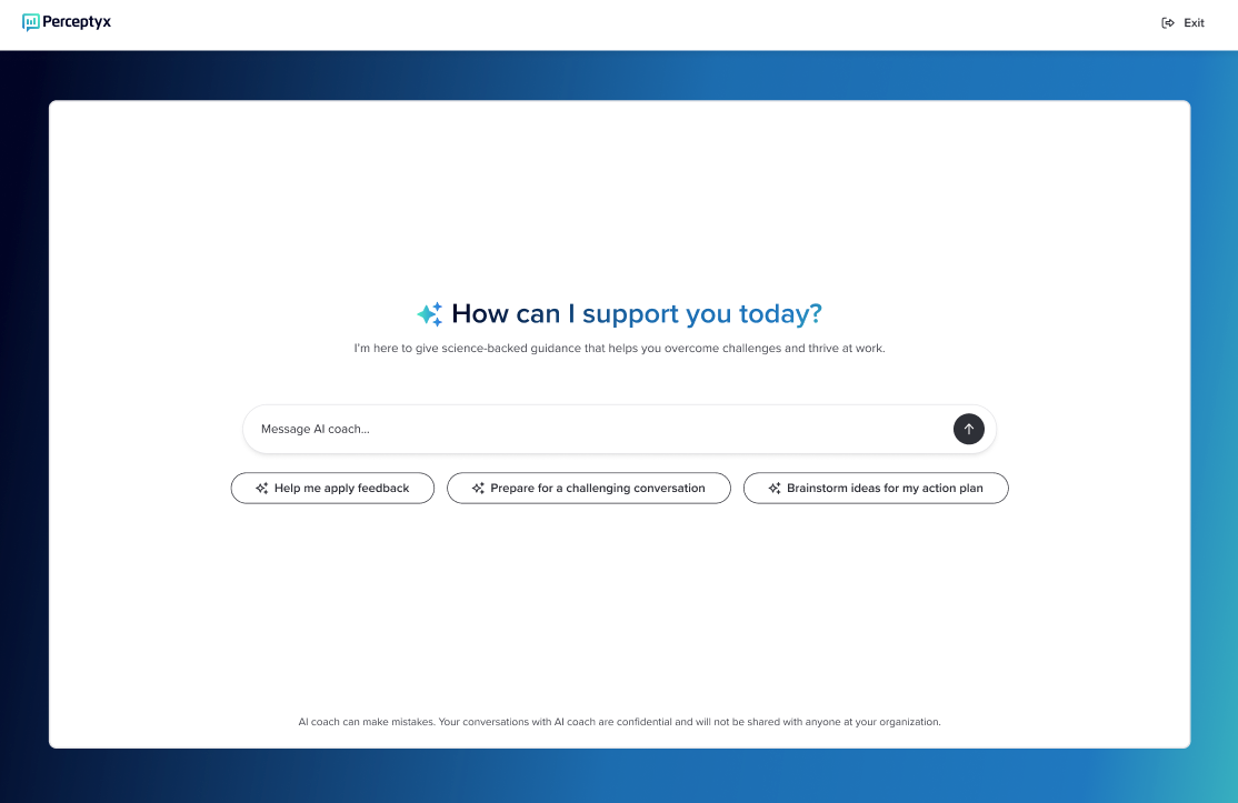 You can type a question into the Message AI Coach box and click the arrow icon or click one of the predefined prompts to help you apply feedback, prepare for a challenging conversation, or brainstorm action planning ideas.