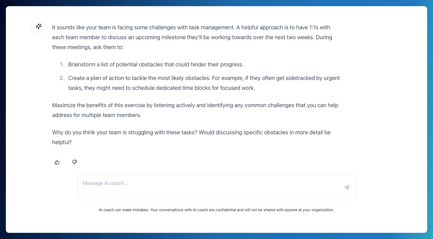 AI Coach responds by asking a clarifying question, if necessary, or providing suggestions.