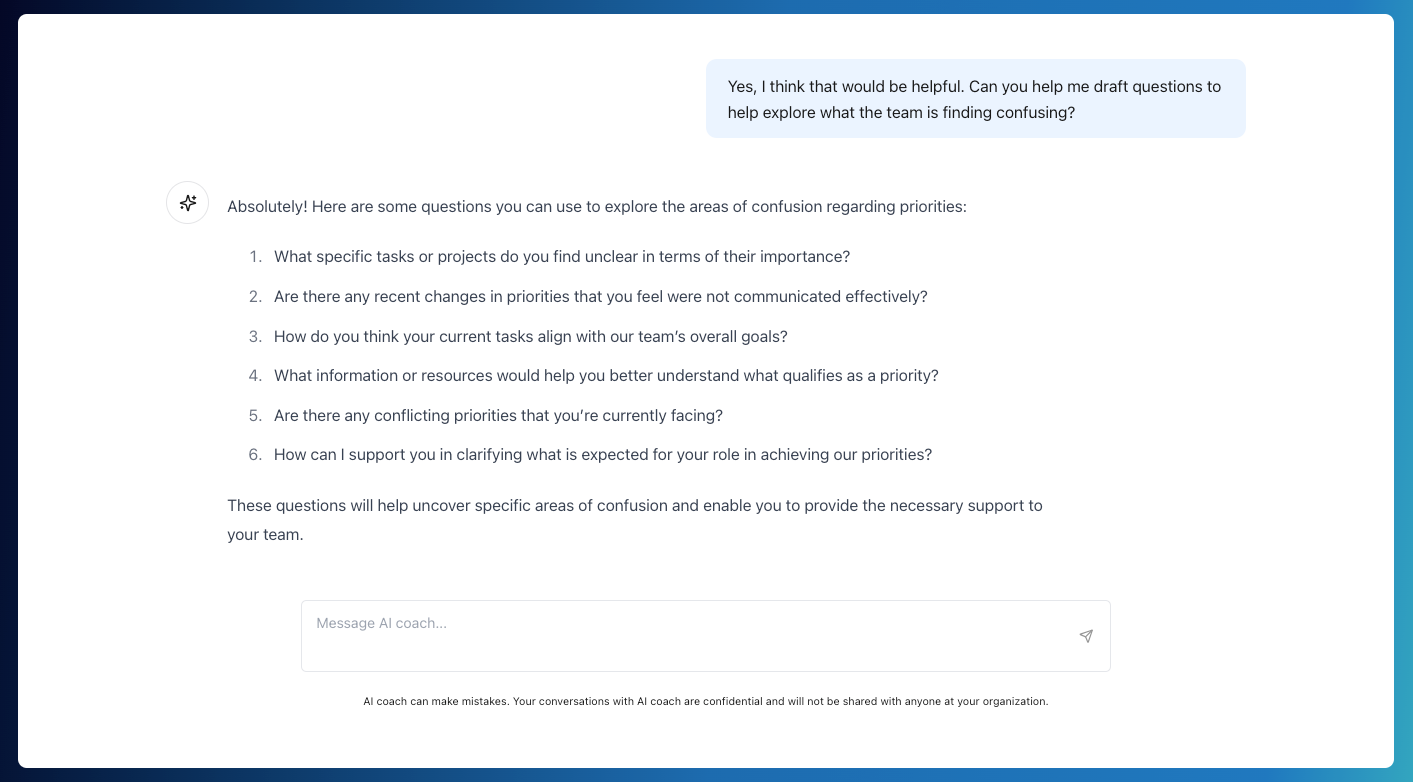 Coaching sessions are designed to be highly conversational. You can ask questions, seek guidance on specific situations, or even ask AI Coach to help draft messages or other content. The images below demonstrate a session where a manager is addressing a concern raised by their team. Through just a few interactions, the manager moves from needing support to taking decisive action. AI Coach offers clarifying questions, suggests a course of action, and even provides tailored questions for the manager to use during a meeting.