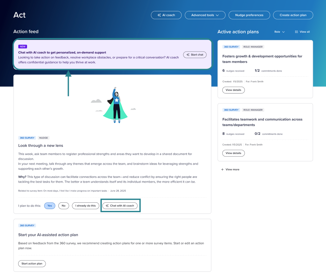 AI Coach tailors its approach to your organization’s values, goals, and competencies, while also considering each employee’s individual development needs. AI Coach proactively engages employees within the flow of work, drawing on nudge theory and behavioral science to help them build new habits in their day to day work.