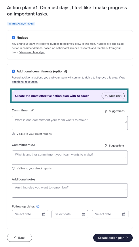 You can initiate a chat session with AI Coach at any time. However, AI Coach can also proactively engage you at key moments (e.g., time to create an action plan) within your flow of work. You can access AI Coach from any of the following entry points:
