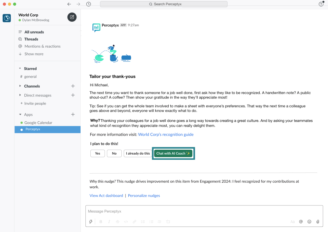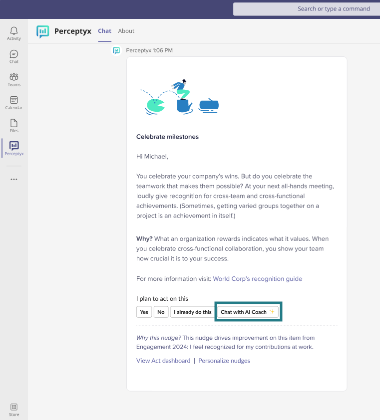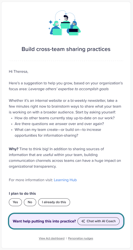 If you receive nudges via Slack or MS Teams, the nudges include a Chat with AI Coach prompt that lets you engage in light weight personal coaching moments in the flow of work. For example, engaging AI Coach from nudges in Slack or MS Teams helps you put nudges into practice in their unique work context.