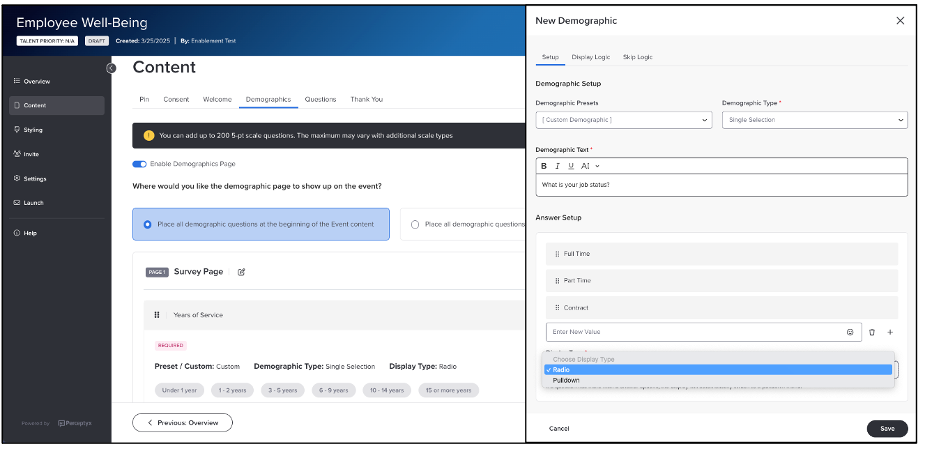Admin and Creator users can now customize how response options for both demographic and event-specific questions are displayed to respondents during listening events. The display type determines how the answer choices appear. You can select between Radio (the default option) or Pulldown.