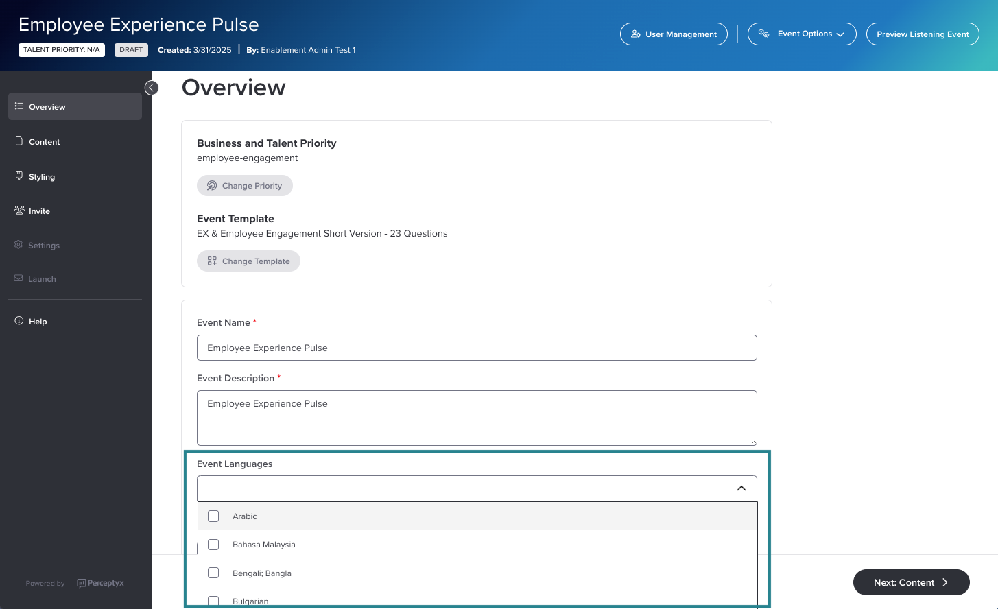 The new languages are available in the Event Languages dropdown in the Overview phase of the Event Builder.