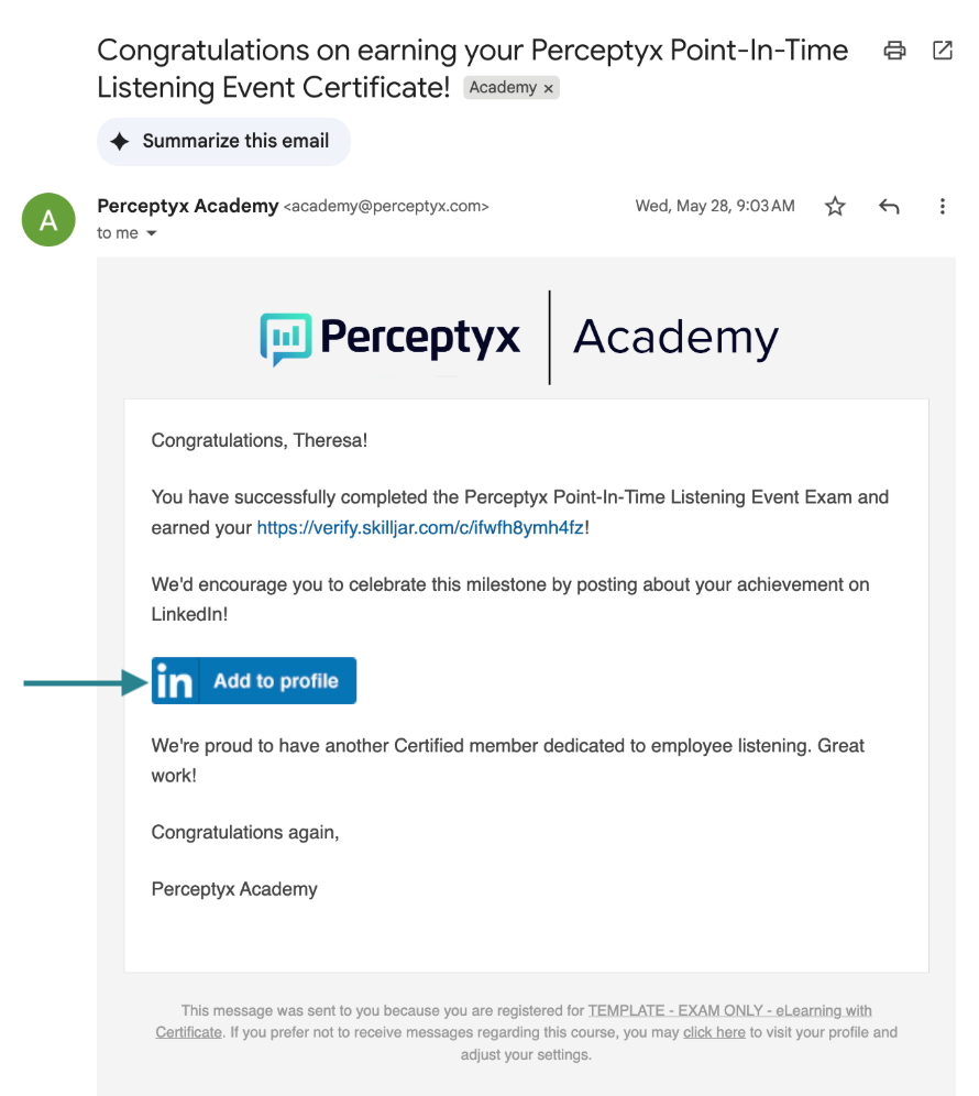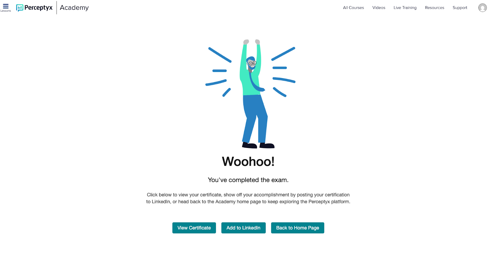 After successfully passing a Certification Exam, you are presented with options to view your certificate and add your certification to LinkedIn directly from the Academy. You are also sent a post-completion email within 24 hours. Adding a Perceptyx Academy Certification to your LinkedIn profile is optional, but highly encouraged.