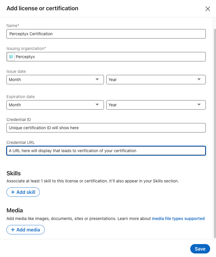 Optionally click + Add Skill or + Add Media to add related skills or media, as applicable.