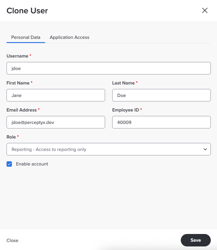 If an existing user is already set up with application access you want to give to a new user, you can clone the user to save time setting up the new user. When you clone a user, the application access options are replicated. All you need to do is enter the personal data for the new user. You can also provide access to additional applications if necessary.