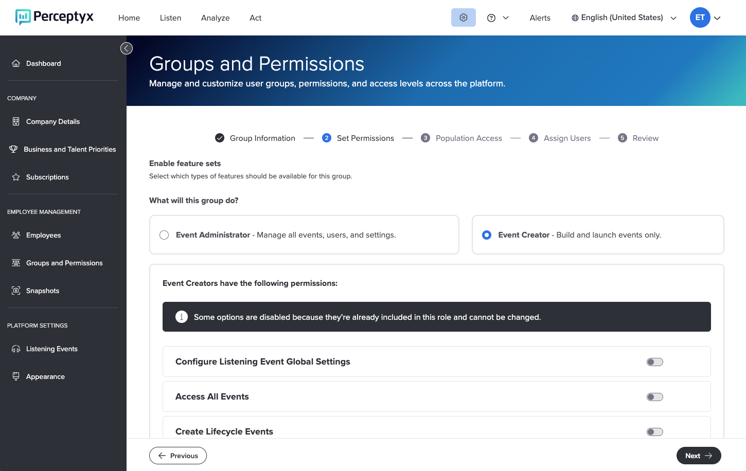 Pre-configured groups for Event Admins and Event Creators based on Perceptyx best practices