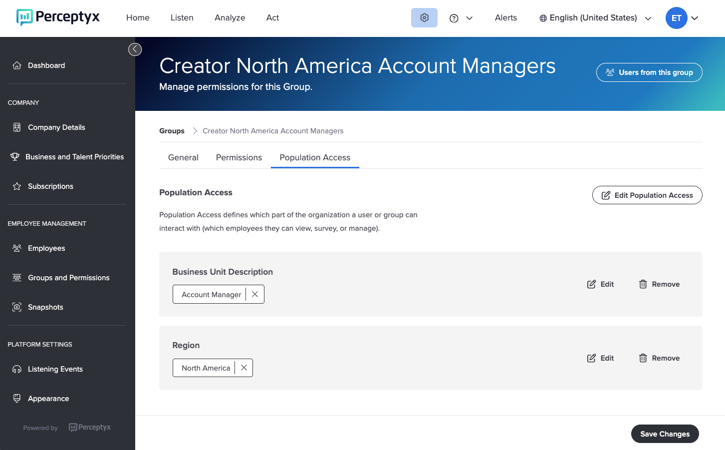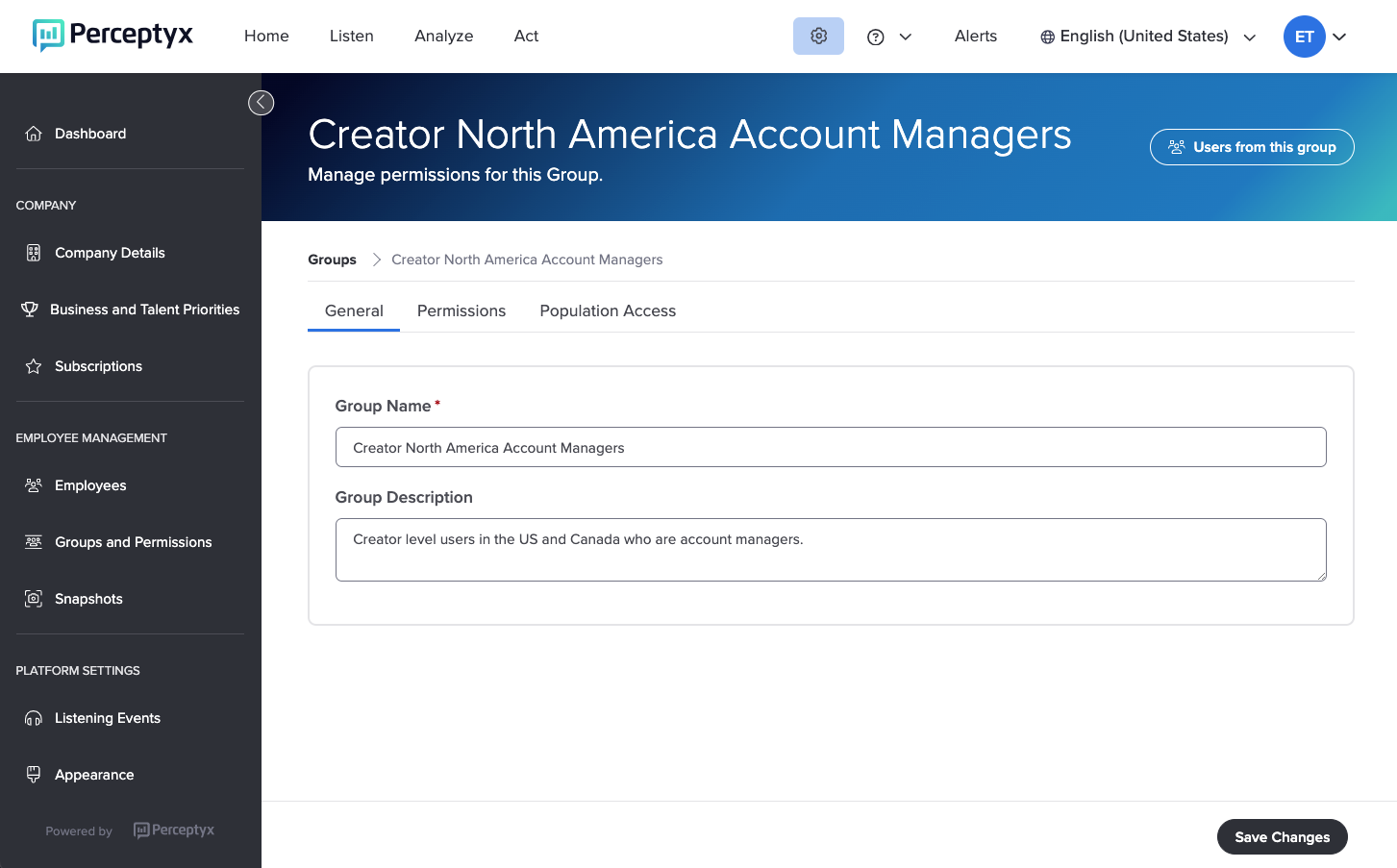 Note: Perceptyx must enable the Groups and Permissions feature to make it available. If you aren’t able to access Groups and Permissions, submit a ticket through the Perceptyx Customer Care portal.