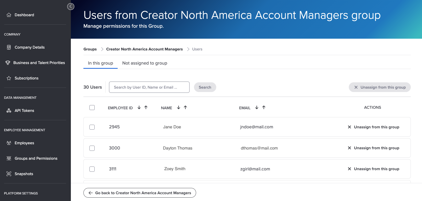 Note: You can click the up or down arrows at the top of each column to sort the list by Employee ID, Name, or Email.