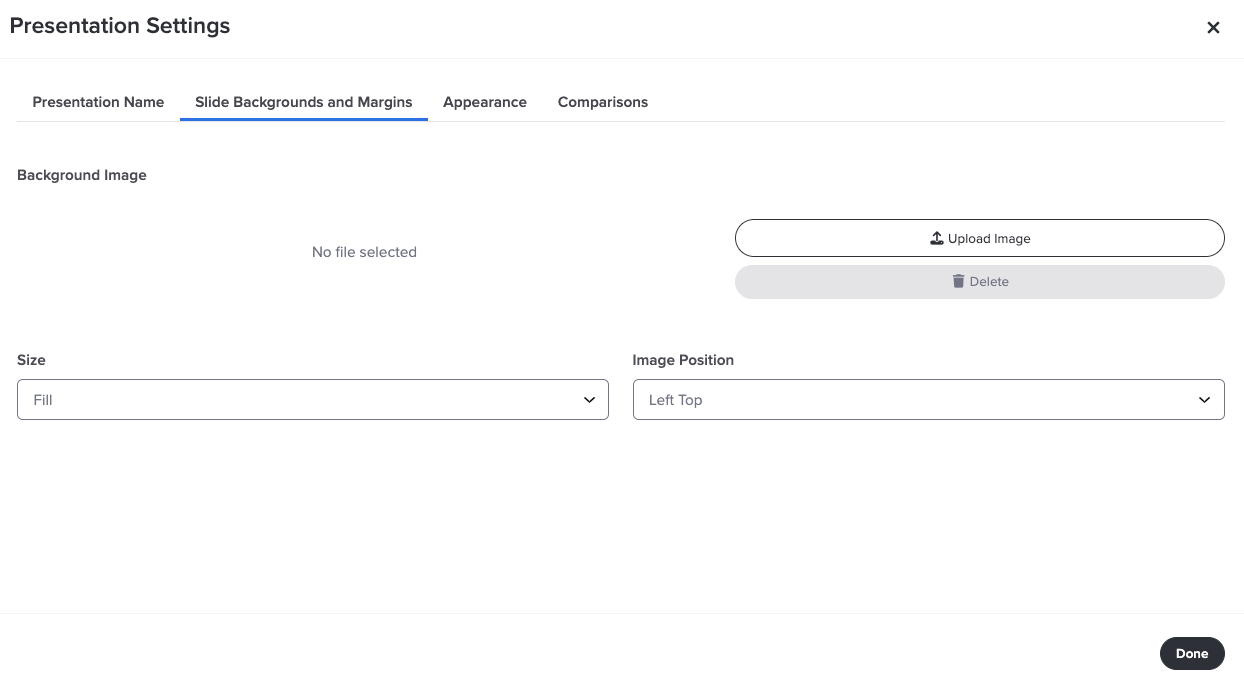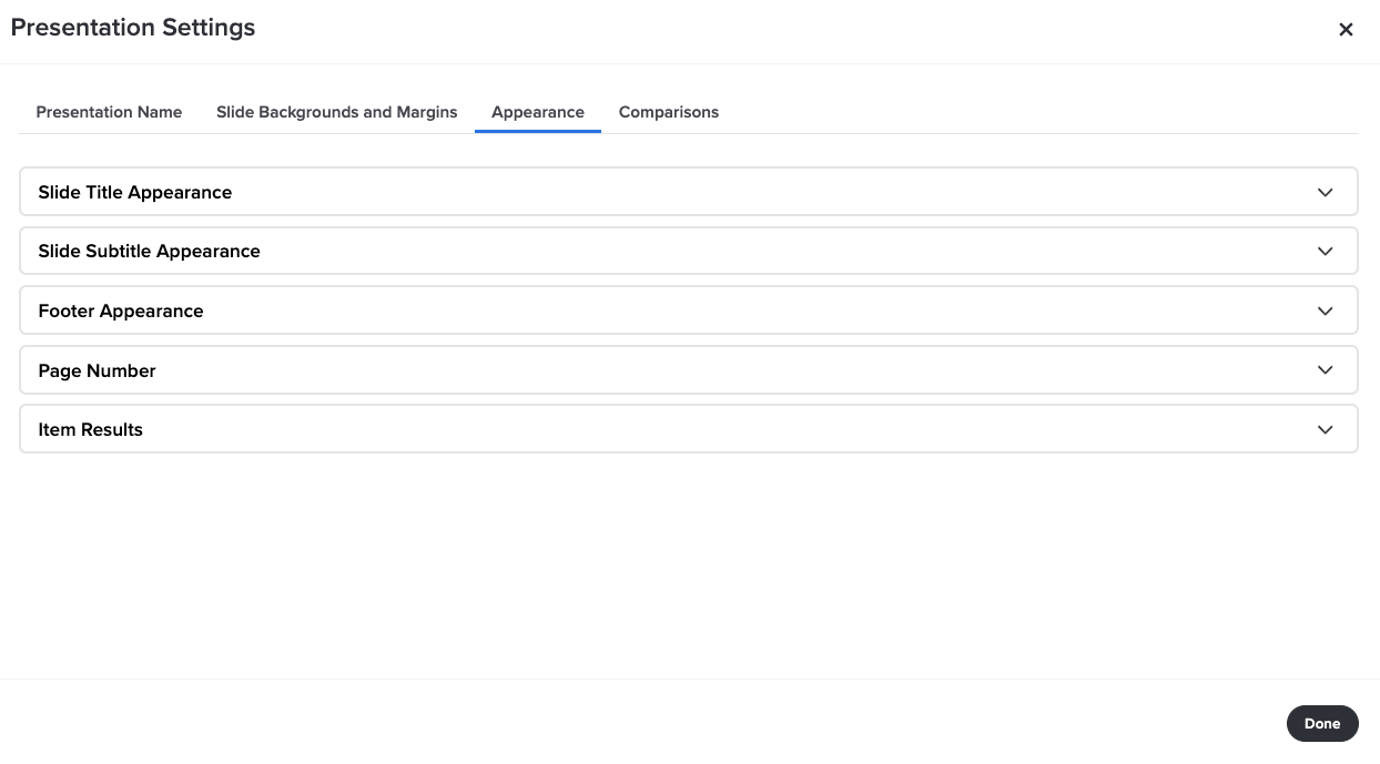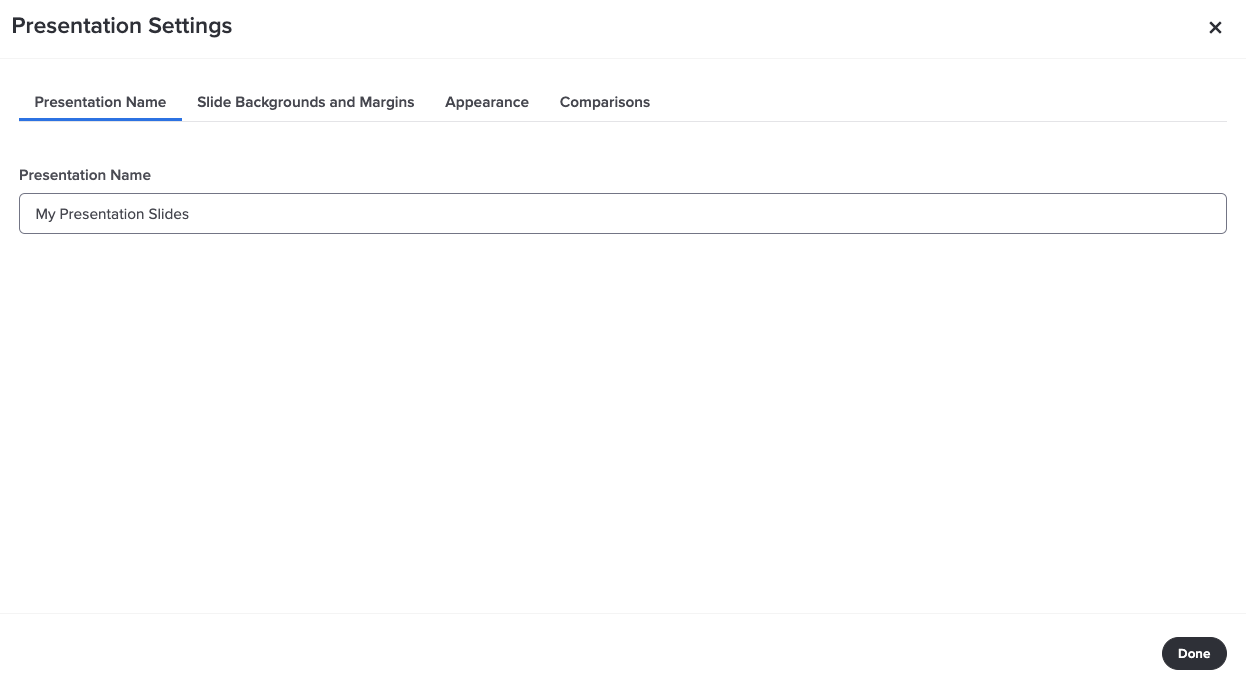 Presentation settings are settings that apply to every slide in the presentation, except for the cover slide. The Presentation Settings dialog box contains four tabs with options for the presentation name, slide backgrounds and margins, appearance, and comparisons.