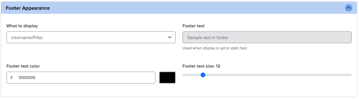 Footer appearance options include what displays in the footer, as well as the footer text color and font size.
