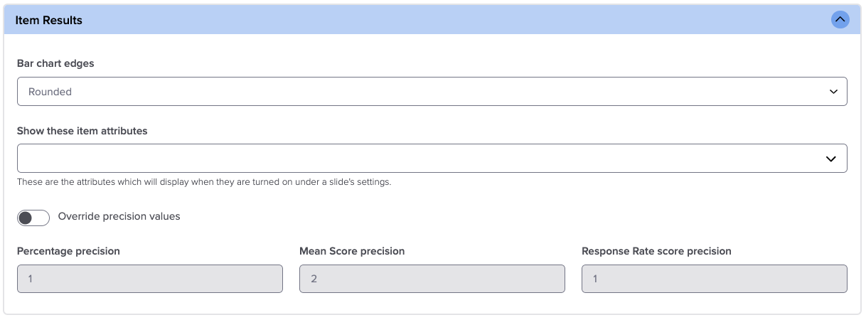 Item results options affect how items display on each slide. For example, whether items displayed as bar charts have flat or rounded edges, which item attributes are shown, and which precision values are used. As a best practice, Perceptyx recommends not overriding precision values.