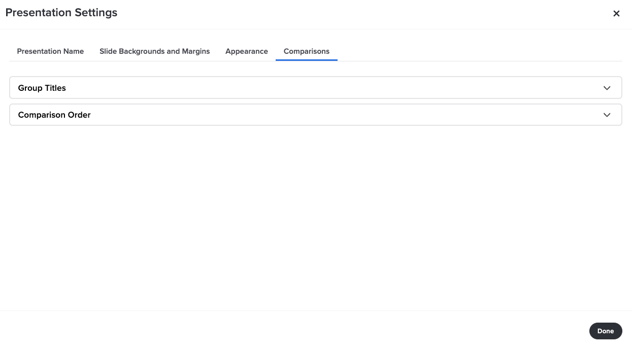 Configuring comparisons in the Presentation Settings allows you to select the relevant data for each individual slide as you edit the default presentation.