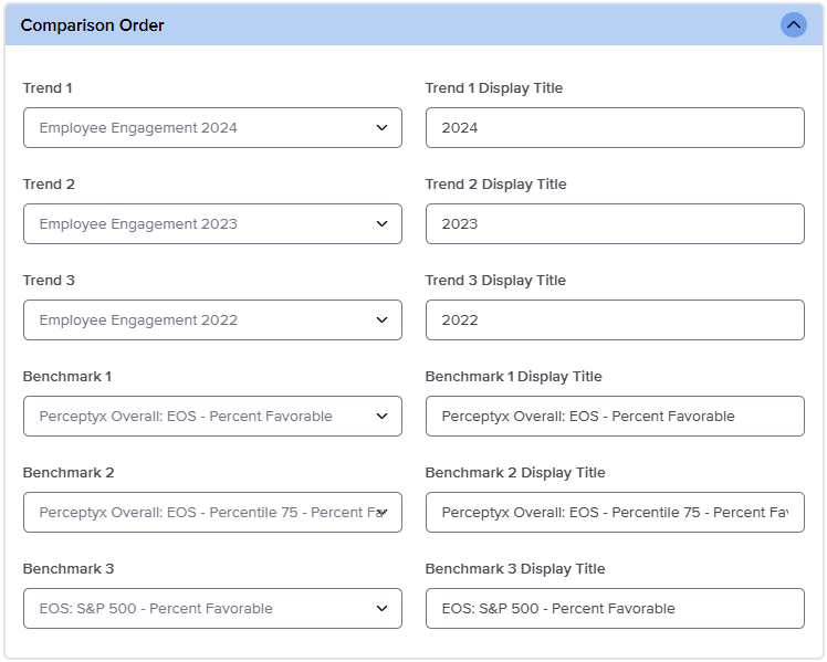 If trend mapping and benchmarks are set up for your listening event, the Comparison Order settings let you decide the order in which trend data and benchmark comparisons appear on your slides.