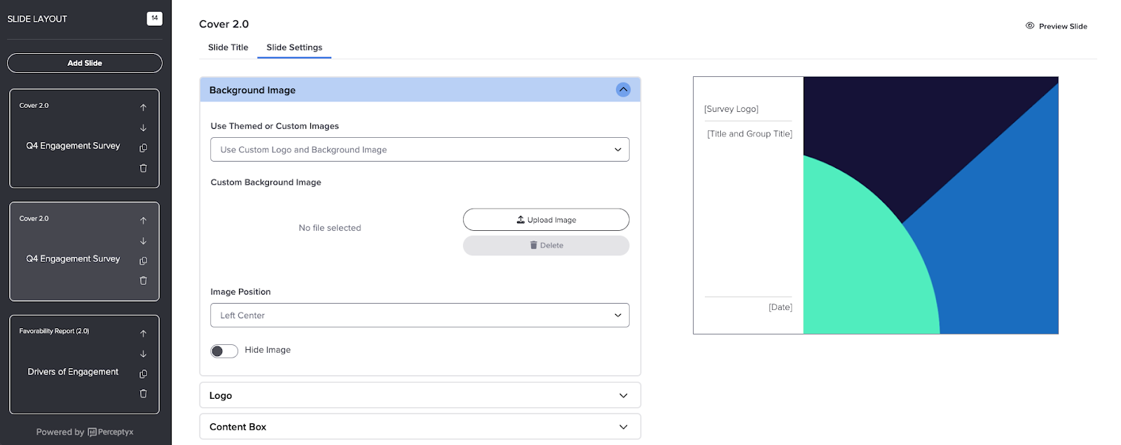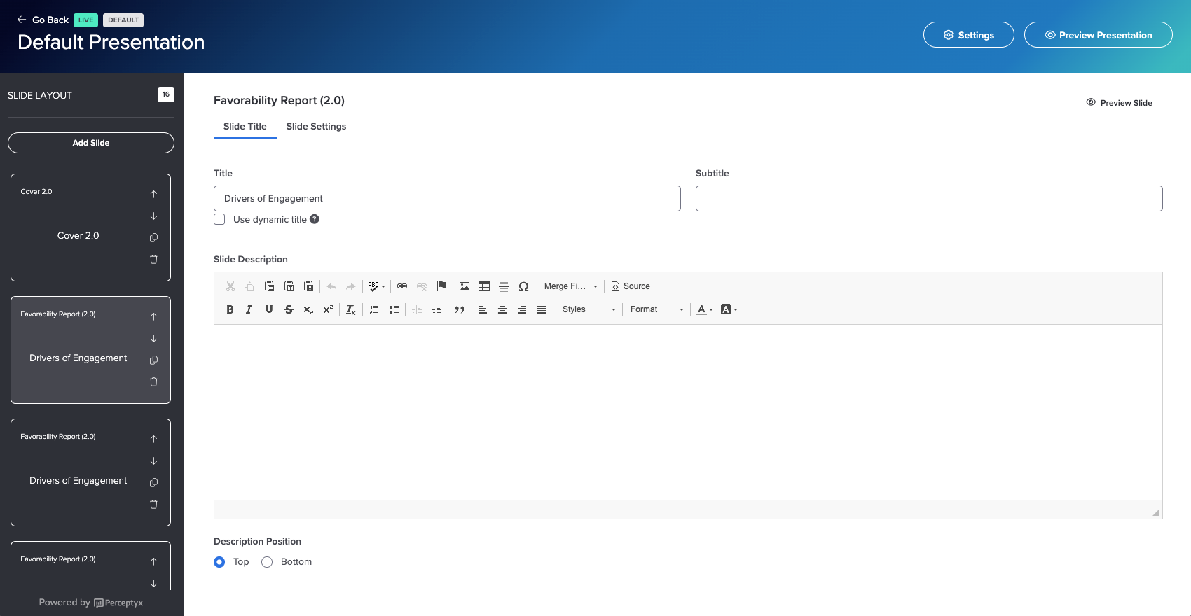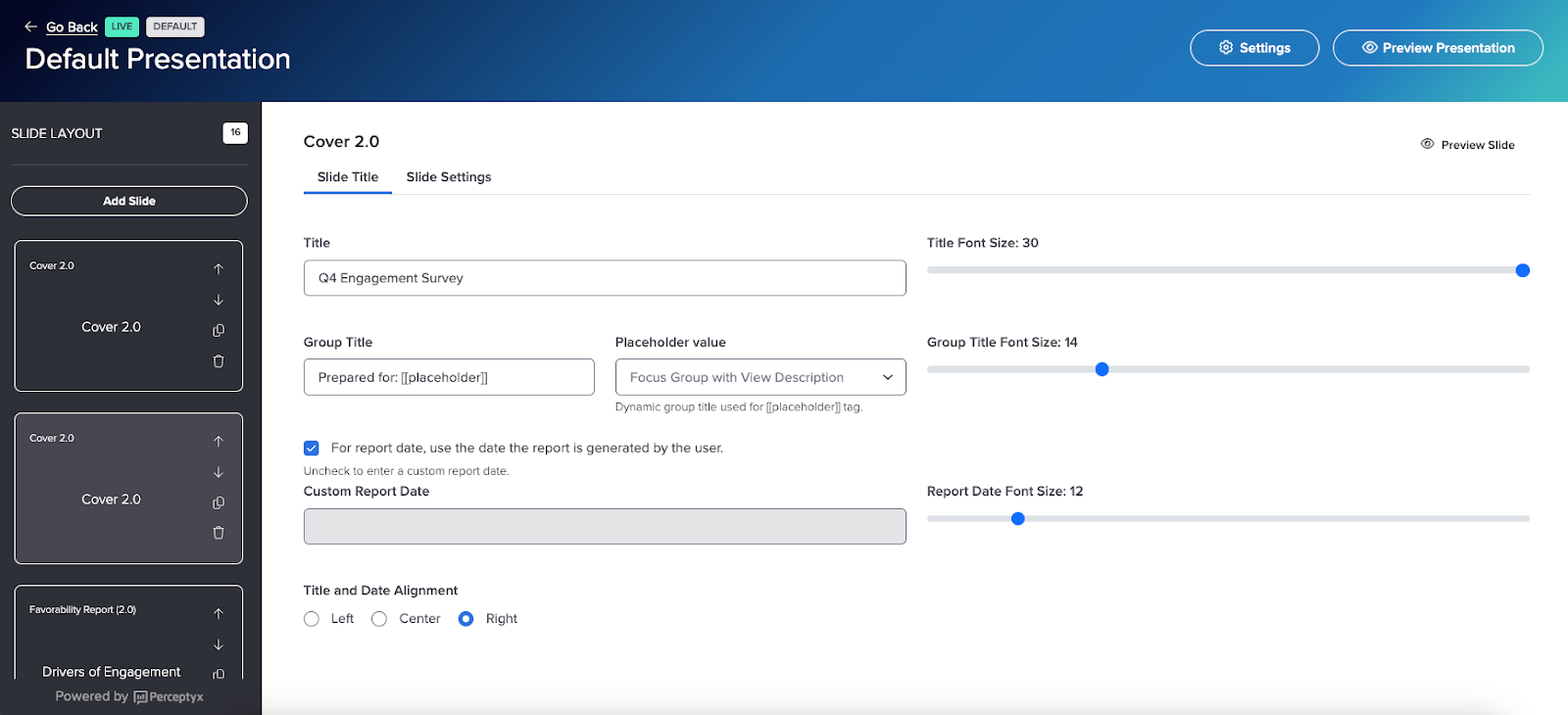 The Perceptyx-curated default presentation includes best-practice slides and is ready to use as-is, but you can customize it as needed by rebranding, reordering slides, adjusting settings, and adding or removing content.