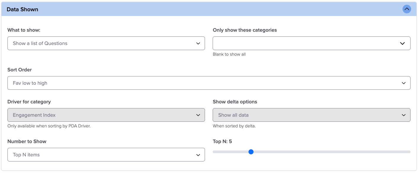 Show Attributes: Specifies whether to show attributes, as applicable, for responses (e.g., Top or Bottom 5 Favorability, Significant Trend Up or Down, etc.). The attributes available to show are determined by the item(s) you specify in the Presentation Settings (the Item Results option on the Appearance tab).
