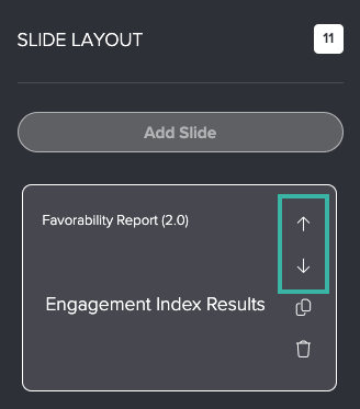 You can move slides up or down in the Slide Layout Editor by clicking the up or down arrows.