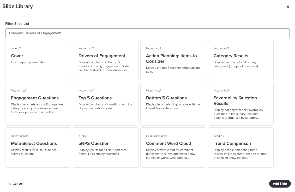 You can view descriptions, use cases, and settings for the available slides in the Presentation Builder Slide Library Overview Deck. After reviewing the options and making your choice, be sure to note the slide title so you can easily add it to your presentation. Added slides automatically inherit the configured presentation settings.