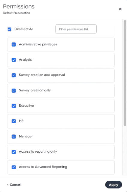 Specify permissions to control who can access the new presentation in Advanced Reporting.