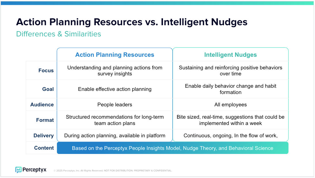 While both Action Planning Resources and Intelligent Nudges support employee engagement and behavior improvement, they do so in different, but complementary, ways. Action Planning Resources help leaders translate survey insights into structured, long-term action plans. In contrast, Intelligent Nudges provide ongoing, bite-sized suggestions that help all employees sustain positive behaviors and build habits over time.