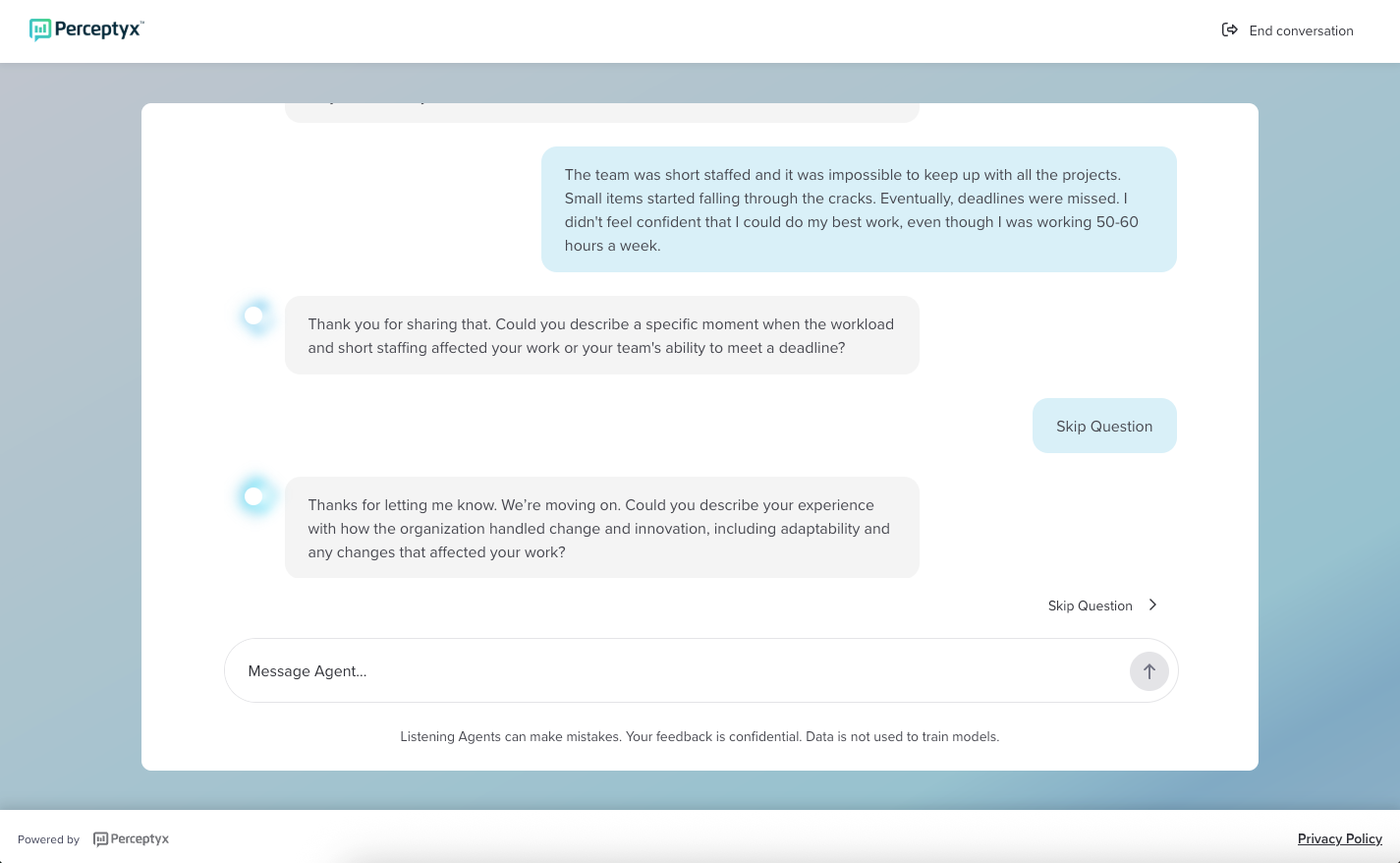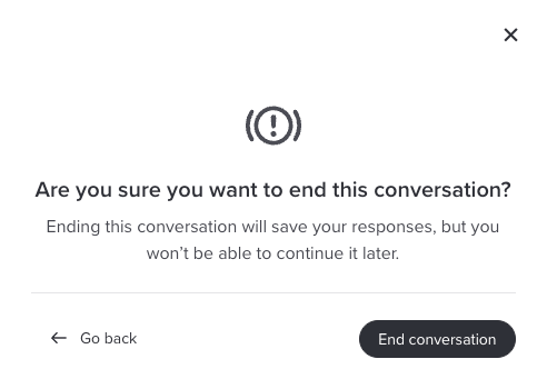 You can end the conversation at any time by clicking End Conversation (top right) or typing something like “I’m done.” Your responses up to that point will be saved. If you choose to end the conversation through End Conversation, you will not be able to return later. If you simply close your browser or navigate away, you can resume the conversation when you return to the link.
