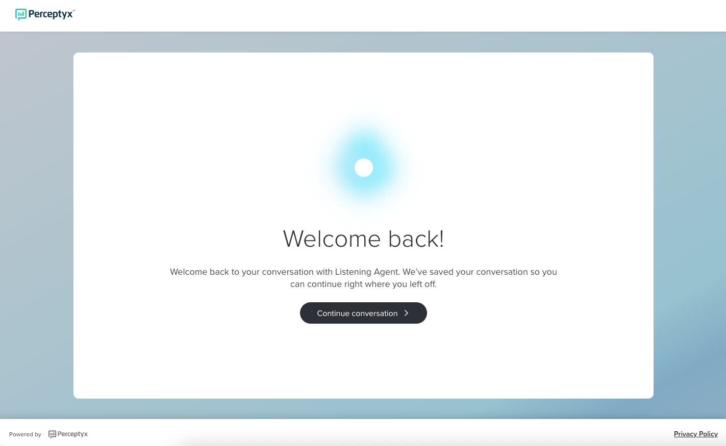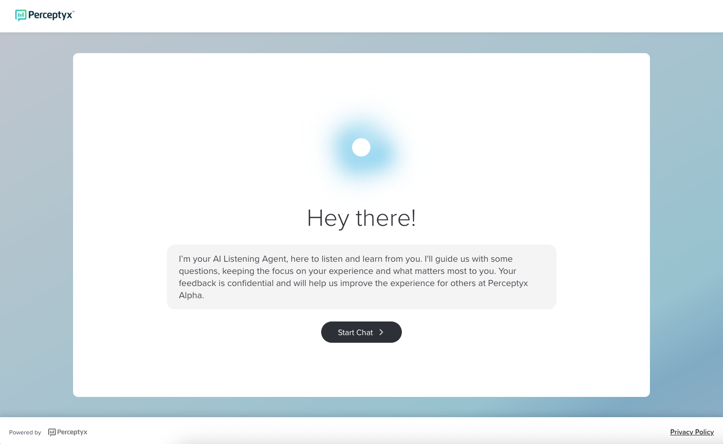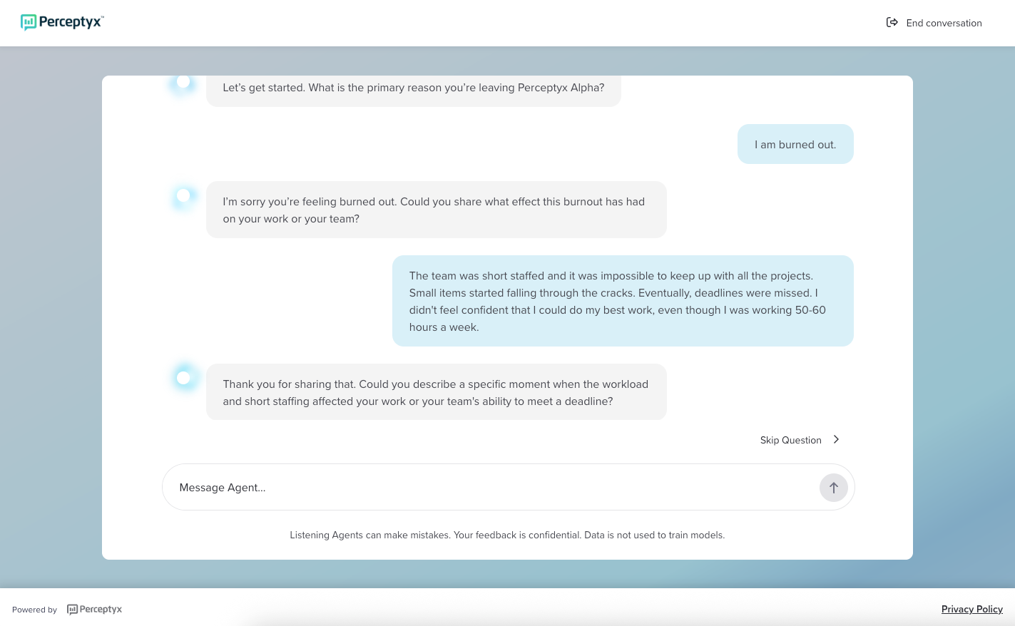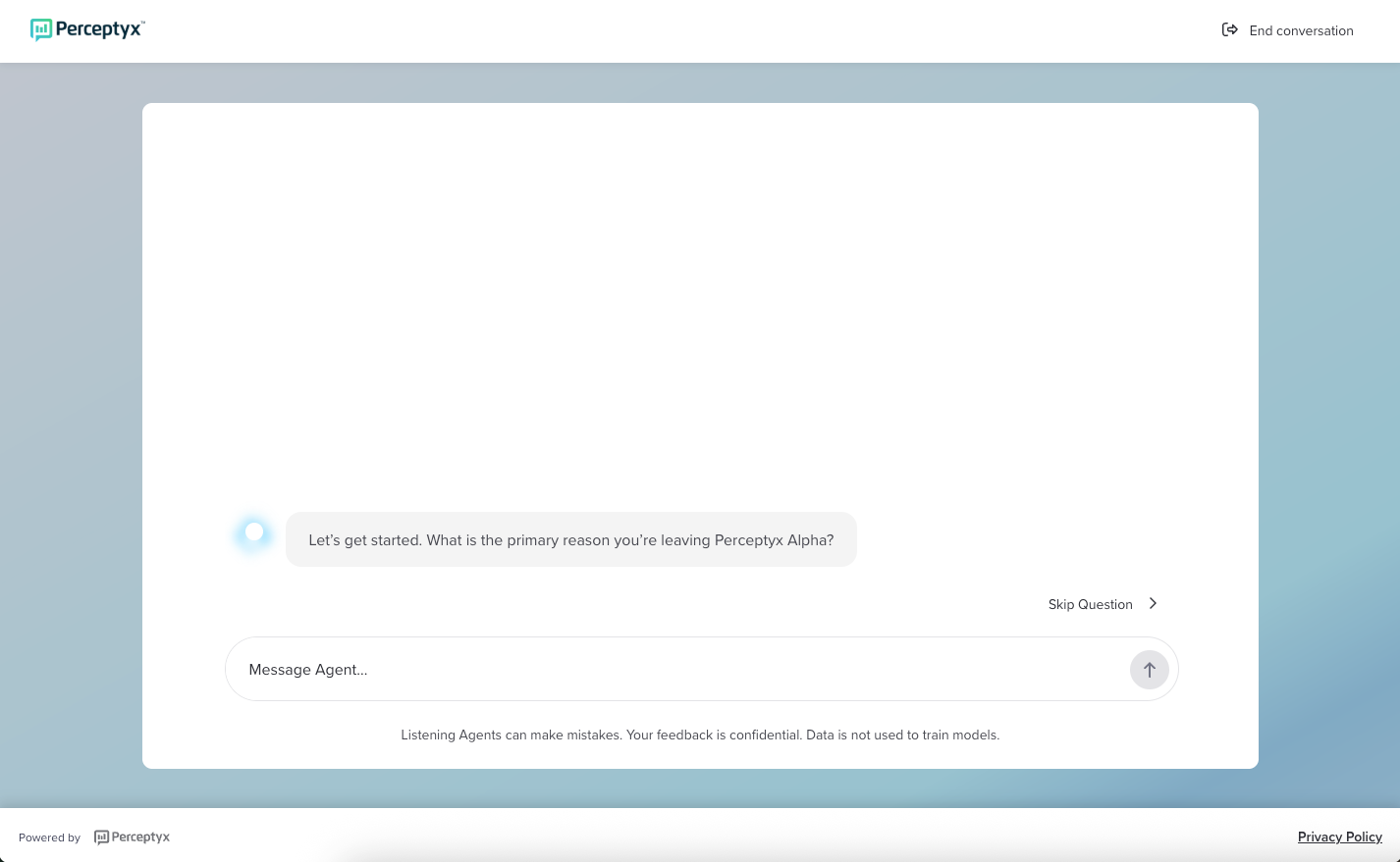 The Conversational Listening Agent presents the first question relevant to your exit experience.