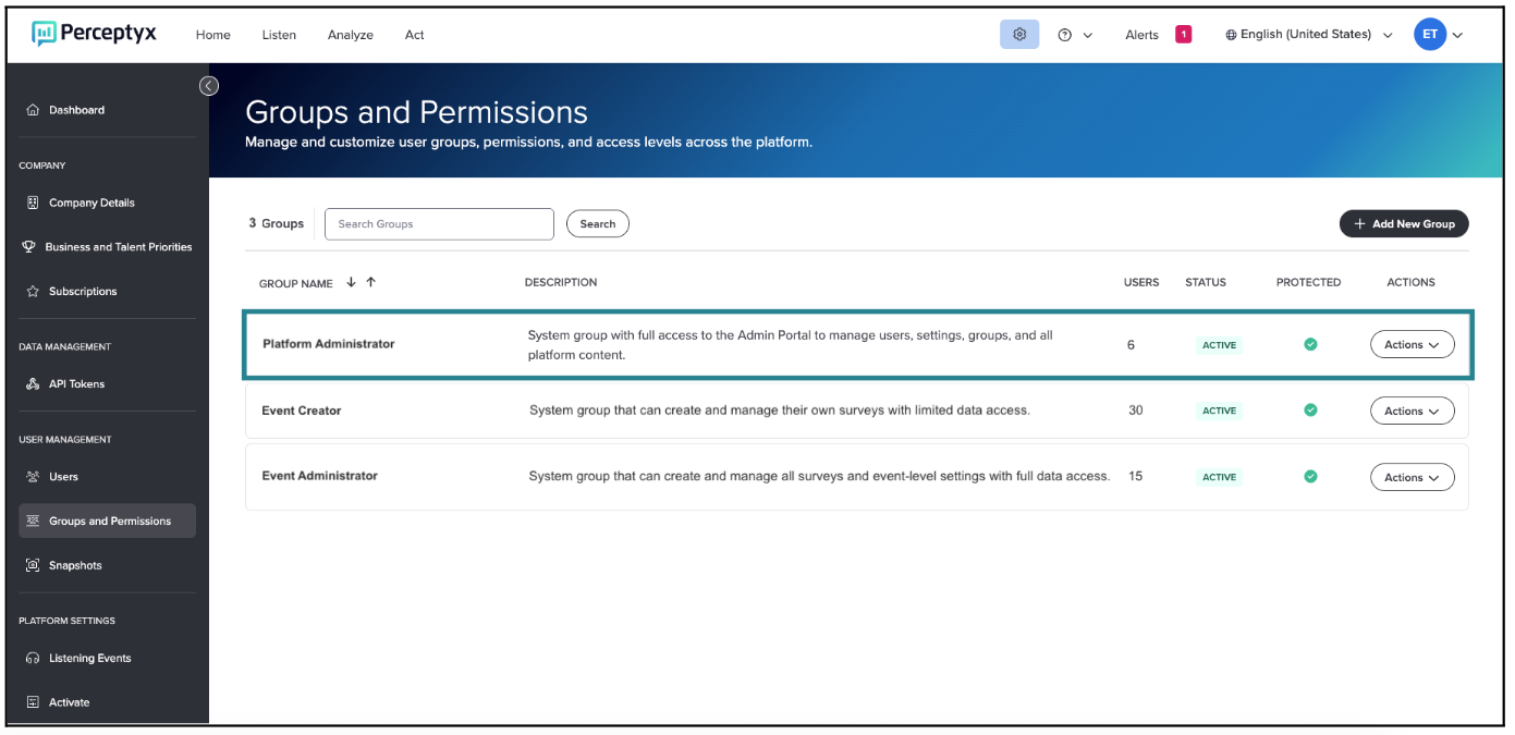 A new Platform Administrator protected group is available in the Groups and Permissions section of the Admin Portal.