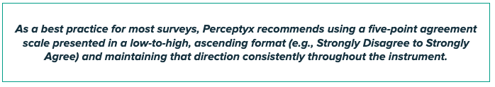 Ascending scales also feel more natural for most people. In Western reading cultures, people are used to thinking left to right as moving from “less” to “more.” A low-to-high scale follows that pattern and pairs neatly with numeric coding (for example, 1 = Disagree and 5 = Agree). That alignment makes the survey feel intuitive for respondents and makes scoring and reporting more straightforward. This best practice is used widely across organizations as a survey design best practice, so adopting the low-to-high five point agreement scale ensures alignment with external benchmarks and supports meaningful comparison.