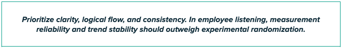 Randomization may be appropriate in experimental research, but it is not recommended in employee experience surveys. Responses are context-sensitive, and a logical, consistent flow supports interpretation, improves the respondent experience, and reduces cognitive load. Randomizing items or pages can disrupt that flow, weaken reliability, and increase behaviors such as speeding or straight-lining.