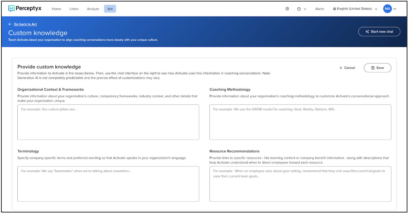 Custom Knowledge enables organizations to tailor Activate’s coaching experience to their unique culture, language, and ways of working. By providing key organizational context, such as frameworks, terminology, and internal resources, Activate can deliver coaching conversations that feel more relevant, consistent, and aligned for employees.