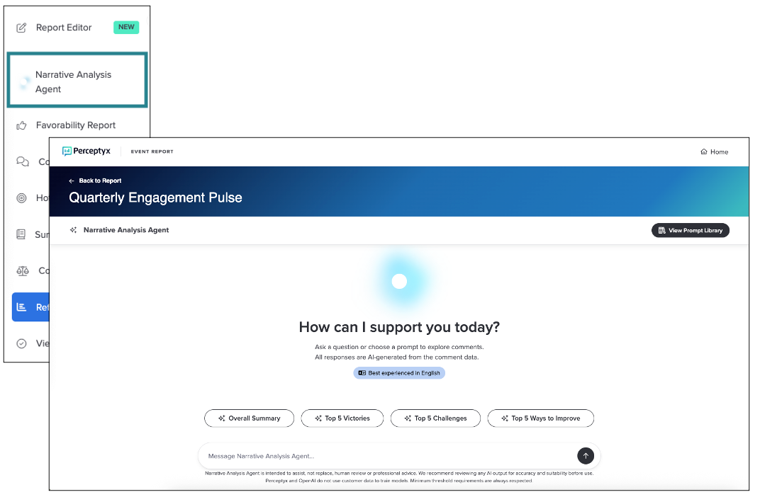 Narrative Analysis Agent must be enabled at the subscription level by Perceptyx. Once enabled, it is automatically available for new closed Point-In-Time listening events. Your Platform Administrator can choose to disable the agent for individual listening events or enable it for previous listening events.