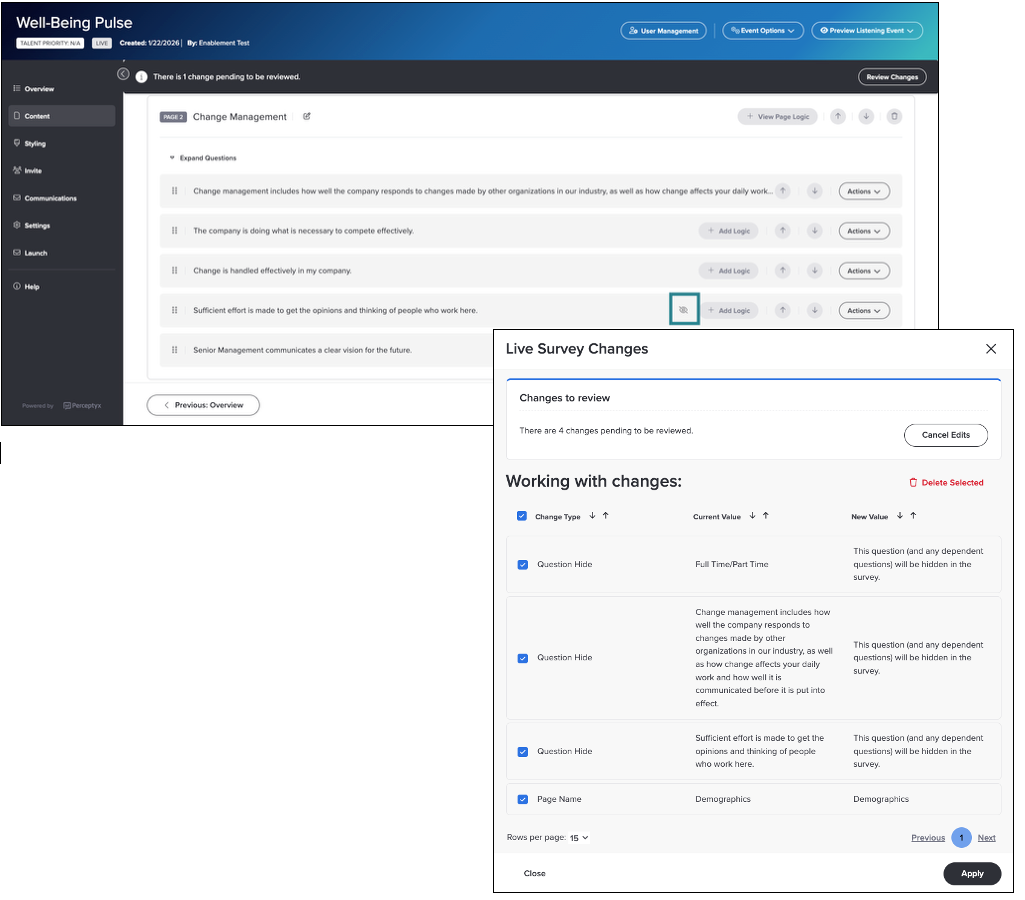 Live listening event editing now includes the ability to hide or unhide event questions, demographic questions, and miscellaneous text. This enhancement gives Admins and Creators more flexibility to refine events in progress without interrupting the respondent experience or relaunching the event. Any responses received for a question prior to being hidden are preserved and available in reporting.