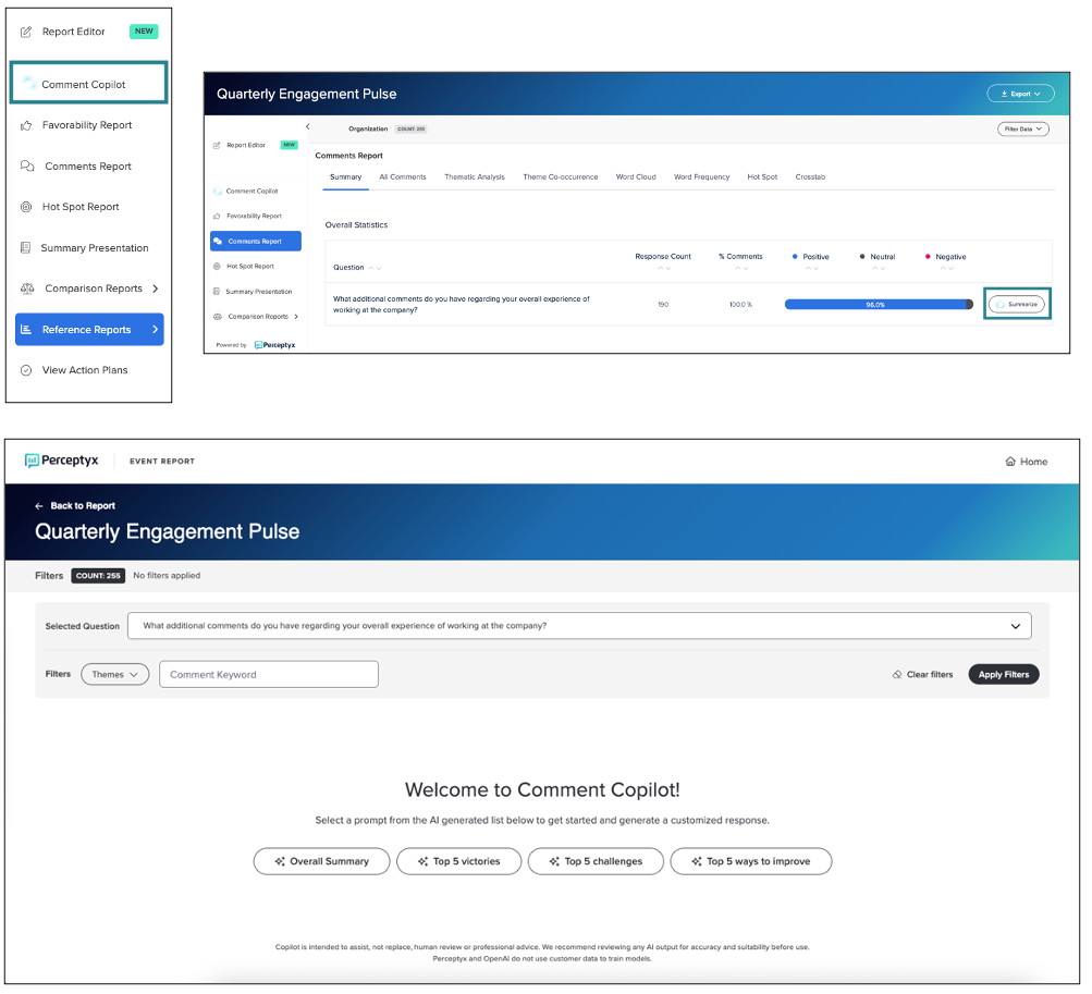 New entry points for question-level analysis: For Comment Copilot, generate summaries for specific questions directly from the Comments Report or select questions within Copilot.